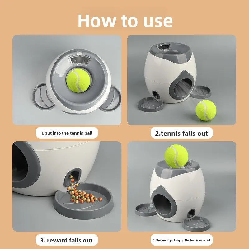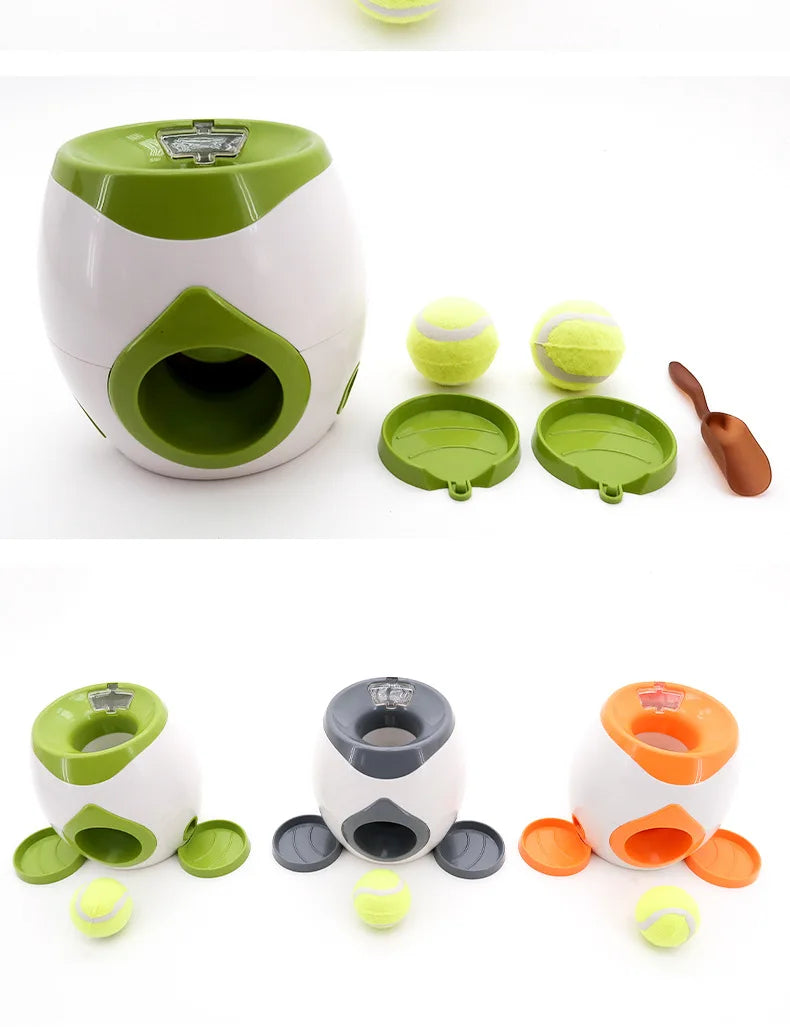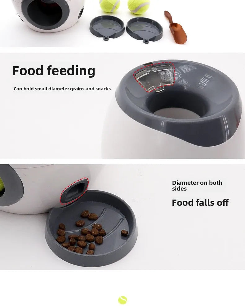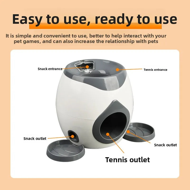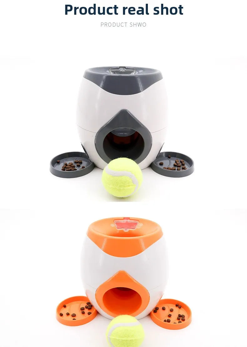 The 2-in-1 Dog Interactive Toy combines a tennis ball launcher and a fun feeding machine. This automatic reward machine is perfect for training and play, allowing your dog to enjoy fetching and feeding in one interactive device.